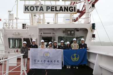 本次登轮船舶为新加坡籍虹城(KOTA PELANGI)集装箱货船,船长330m,总吨114380,运载货物数量为1879.0。在会议室,船长和大副很热情地接待了调研成员,来自马来西亚的船长真诚地表达了对海运学子以及相关口岸人员的欢迎。交流中,华裔大副耐心地介绍了船舶的基本情况,包括船舶的构造、航行路线、船员组成等。在他们的讲解下,同学们对这艘庞大的集装箱货船有了更加直观的认识。
