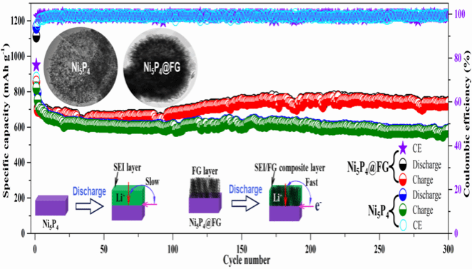 商业化的锂离子电池阳极碳材料的理论比容量较低,目前仍未找到理想的替代品。本研究团队研制出一种比容量是碳材料两倍多的空心结构磷化镍,并采用石墨烯构建固体电解质界面膜的方法有效解决其循环稳定性差的问题,可实现300次循环充放电无明显容量衰减